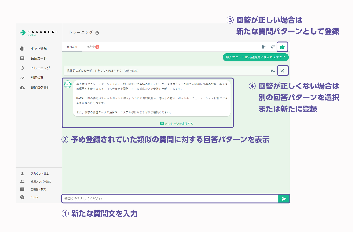 今回取得した特許は、既にKARAKURI管理画面に実装されており、これにより直観的且つ効率的な質問・回答パターンのトレーニング機能を実現しています。