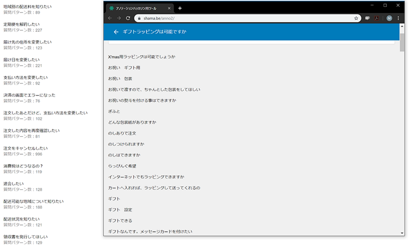 例えば、「配送方法」という言葉は、「配送」と「方法」という単語に分けられます。この「配送」と「方法」をそれぞれ同義語で置換し、「配送の仕方は?」「郵送の方法は?」などというように機械的に組み合わせて、質問パターンを増やしていく戦法です。