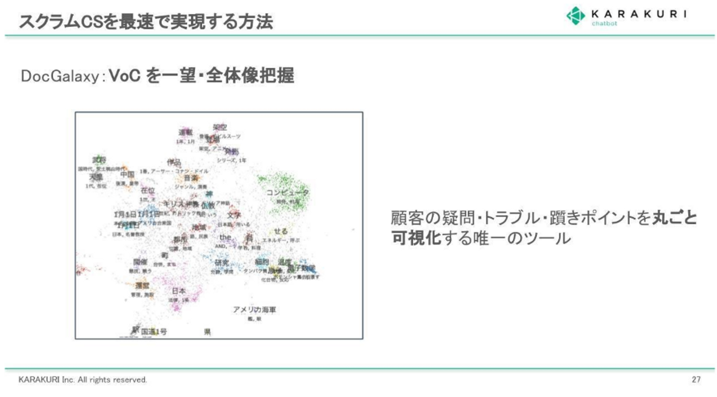 例えば VoC(お客様の声)を効率的・定量的に分析する上で,自然言語処理や機械学習などのAI技術は欠かせません。私たちは,ただ単に効率化するだけではなく、VoC 分析をとても面白くすることを目指して DocGalaxy というツールを開発しています.このツールは、AIが「顧客の疑問・トラブル・つまづきポイント」を丸ごと可視化します。これについては、近いうちに CS Tech チャンネルで紹介したいと思っています。
