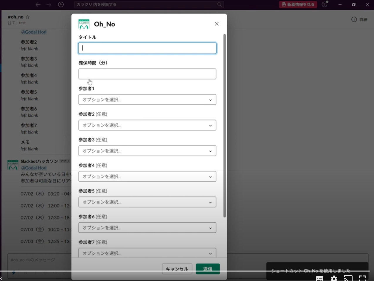 面倒なスケジュール調整をbotにやらせたい!タイトル&時間&参加者を入力すると、Slackbotがカレンダーを確認し、候補日を通知してくれます。参加者はリアクションするだけで、リアクションを集計してカレンダー登録までbotが行う優れモノ!