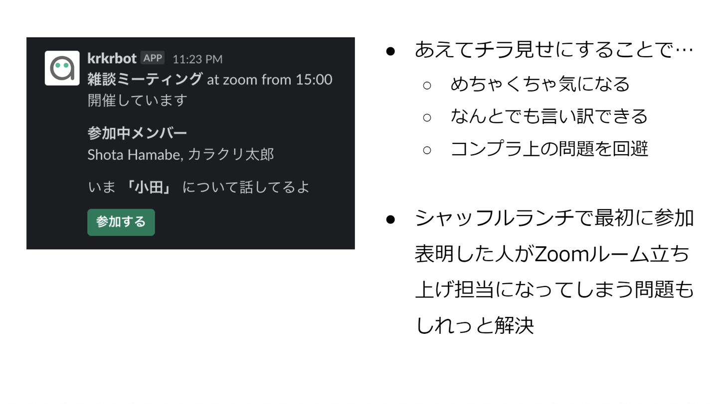 カラクリでは、Zoomでシャッフルランチを開催しています。ランチに限らず会議など「ちょっと遅れて参加」するシーンってありますよね?場の雰囲気がわかれば入りやすいのに!そんな時、覗き見ボットを使うと、誰が参加していて、何について話しているかが分かるようになり、空気をよんで気軽に途中参加が可能になります。