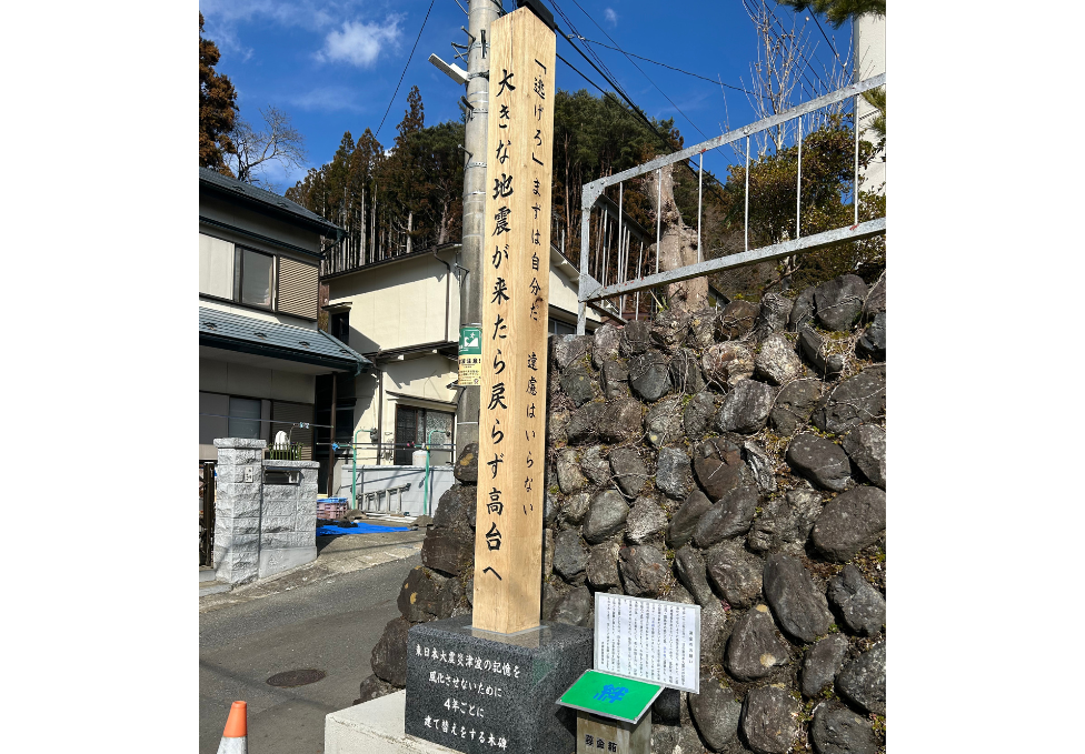 <木は朽ちるから、建て替えが必要。その度に震災とその教訓を思い出せるようにと、建てられた木碑>
