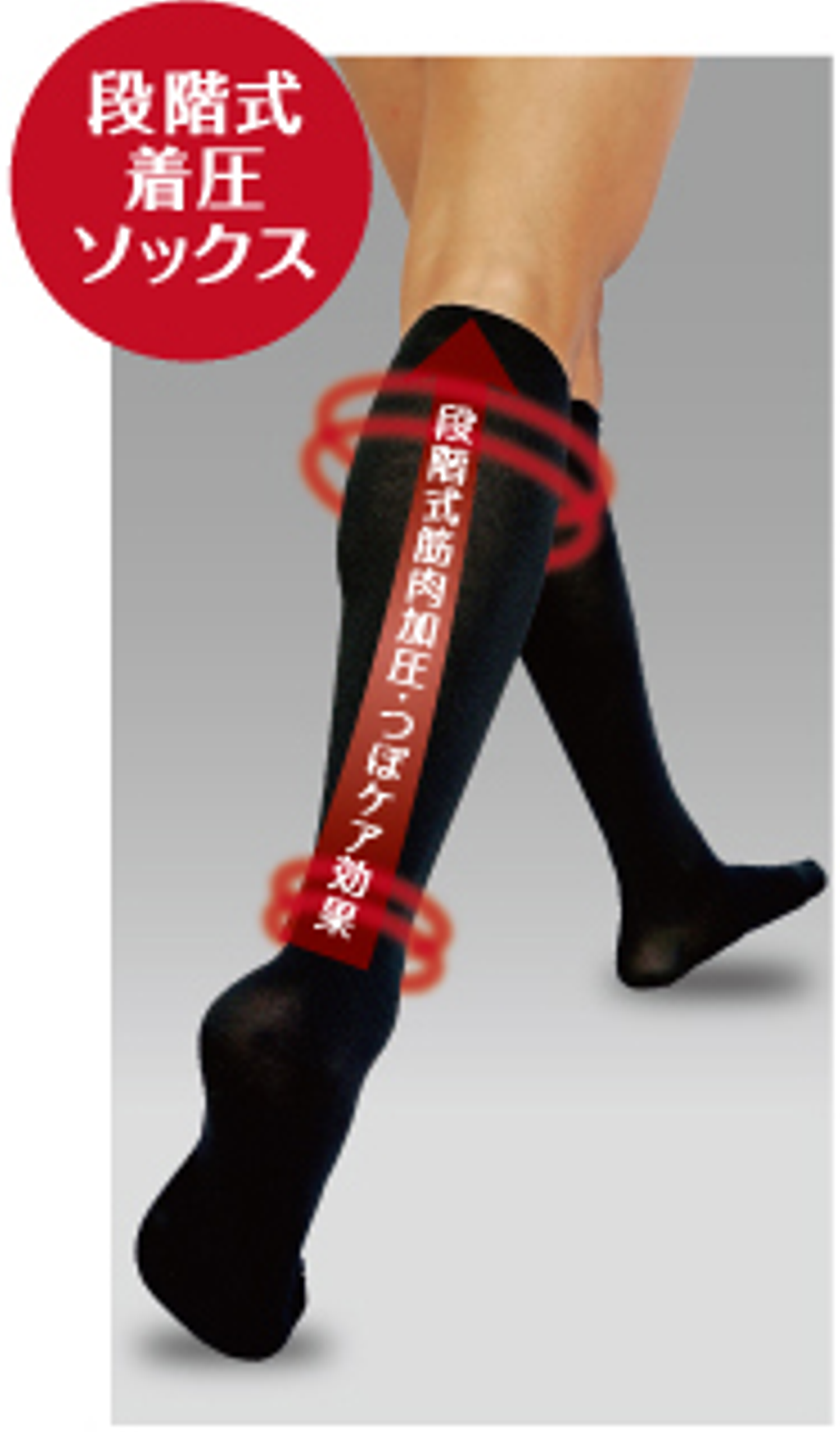 この「段階圧力設計」により足を段階的にひきしめて上へ押し上げることで