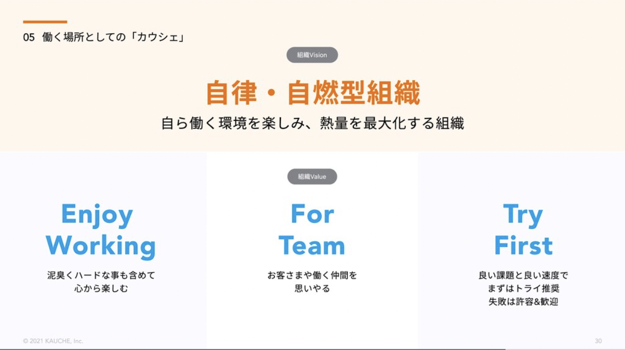 カウシェは、会社ビジョンである「世界一楽しいショッピング体験をつくる」を実現するために、組織ビジョン「自律・自燃型組織」を掲げています。