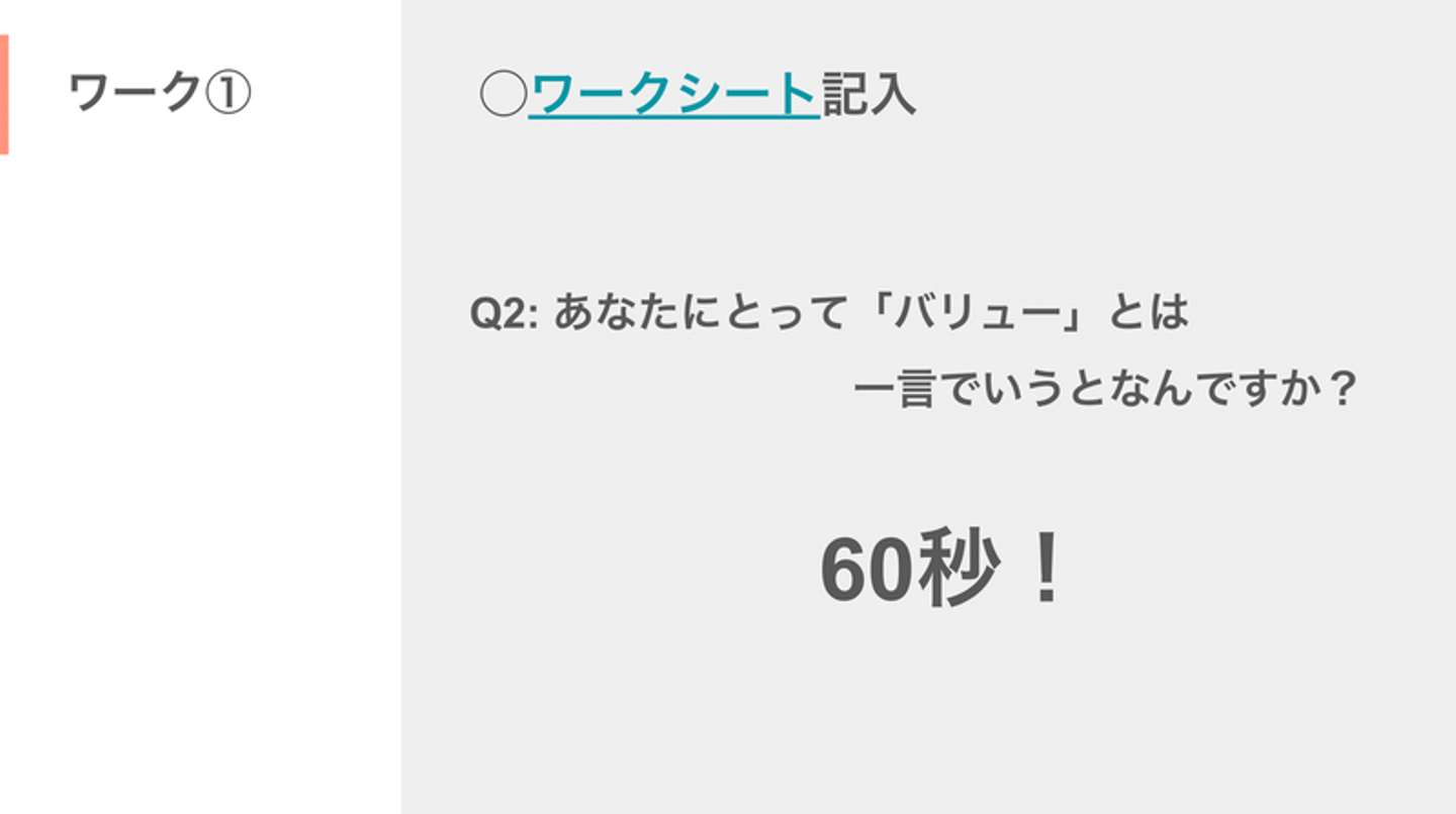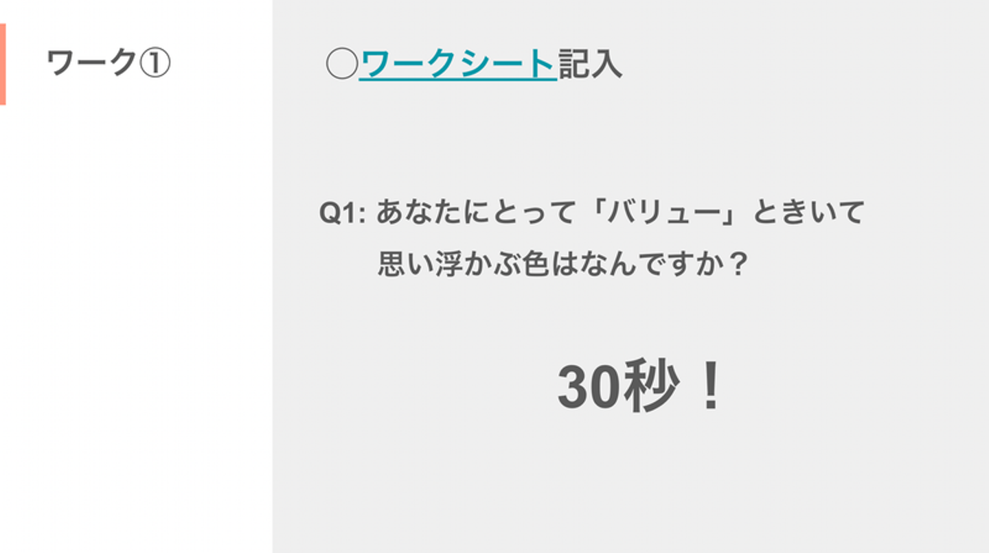 ワークはいくつかの質問をメンバーに投げかけ、回答を配布したシートに記入していく形で進行。直感的に30秒で質問に答えていきます!(頭に浮かんだ答えを迷わずすぐに書くのがコツ!)