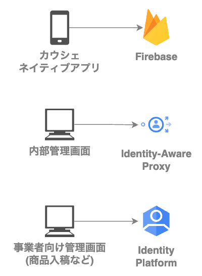 事業者向け管理画面の場合、利用者はカウシェ内部のメンバーではなく、事業者の方々になります。事業者の方々はそれぞれ独自のメールアドレスを持っており、管理画面に任意のメールアドレスでログインできる必要がありました。メールリンクによる認証を行いたかったのと、将来的には別の方法やMFAなどの要件が求められる可能性があったので、Identity Platformを用いることにしました。
