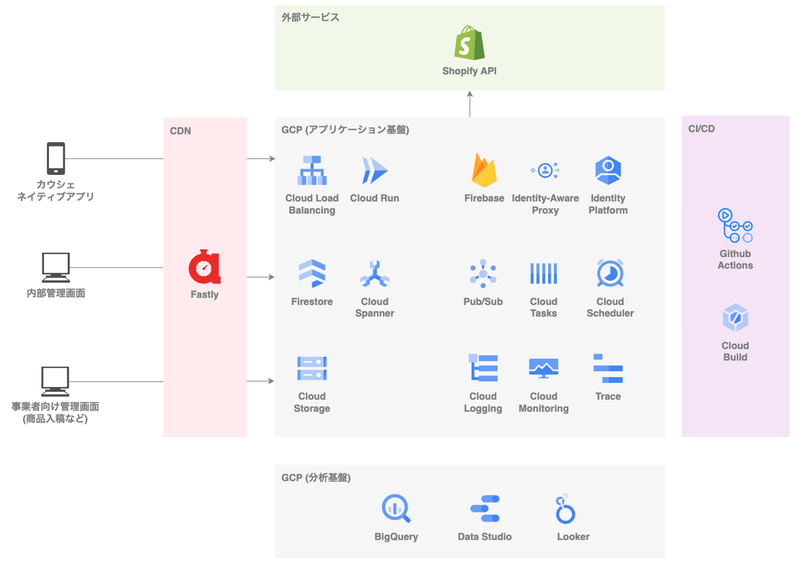 CDN、LB、Spanner、認証系サービス、Lookerなどなど、当時と比べると全体的に利用技術が増えています。