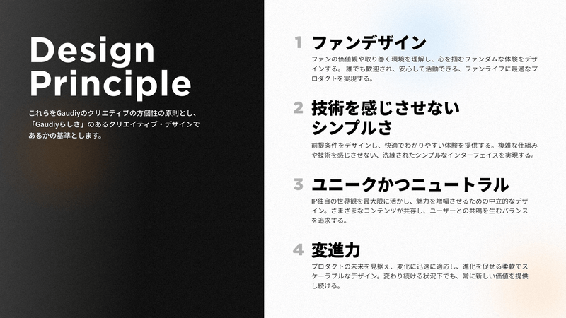 2022年はデザイン組織の人数規模が1年で4倍程度になったこともあり、複数人・複数プロジェクトが並行してデザインを生み出していく状態になりました。そんな中で、Fanlinkをデザインするにあたり、Gaudiyが目指すクリエイティブ・デザインの方向性を「デザイン原則」として定義しました。
