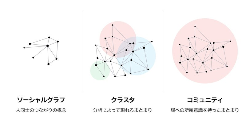 一般的な「コミュニティ」の定義:所属するメンバーが所属意識を明確に持っているもの。カウシェの場合:現状、「場に所属している」という意識は作っていない。分析によって露見される、流動的な共通点を持ったまとまり=「クラスタ」と言える。