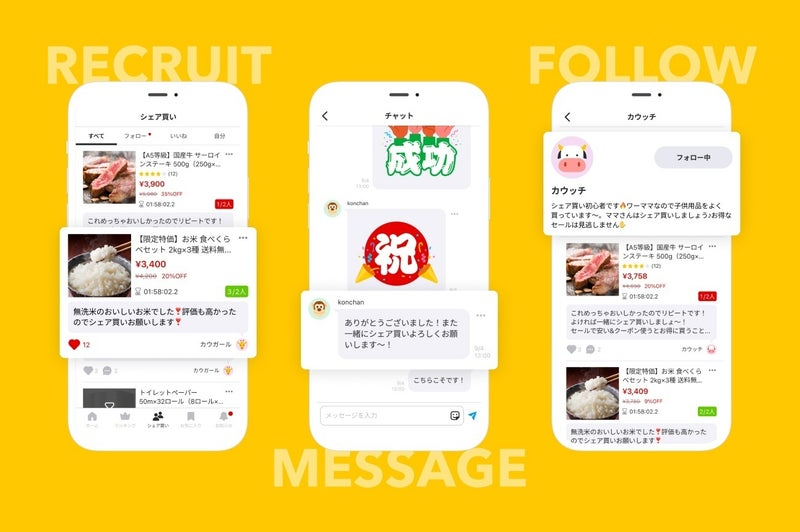 ・おすすめコメントによって「シェア買い」したい気持ちを醸成するアプリ内には一緒に買う人を募集する機能があり、商品のおすすめコメントを設定できるようになっています。店員さんや友人のおすすめによって買いたい気持ちが醸成されるようにリピーターのおすすめや、シェア買い上級者の情報によって購買意欲が高まる機能です。・商品を買いたい人同士でコミュニケーションが取れる一緒に買う人や、買うことを検討している人同士でコミュニケーションを取ることができます。スタンプで気軽にやり取りする方法もあれば、テキストメッセージで詳細にやり取りすることもできます。・シェア買いした人とフォロー/フォロワーになり、お買い物友達ができる一緒に買った人同士で相互フォローになることで、同じ趣味嗜好を持った人同士が繋がって、次回以降のシェア買いも一緒に行うことができます。