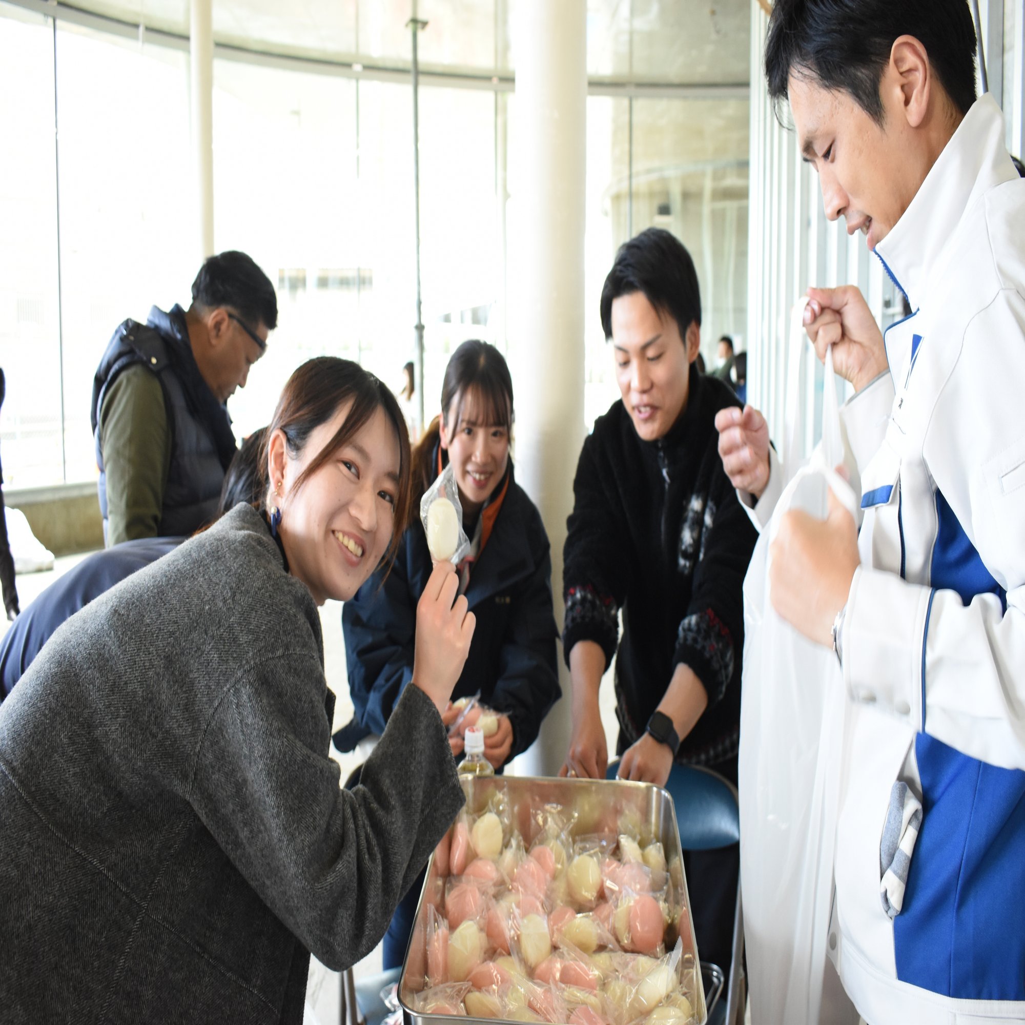 - 社屋内の吹き抜けを活かした、今しかできないお餅まき!