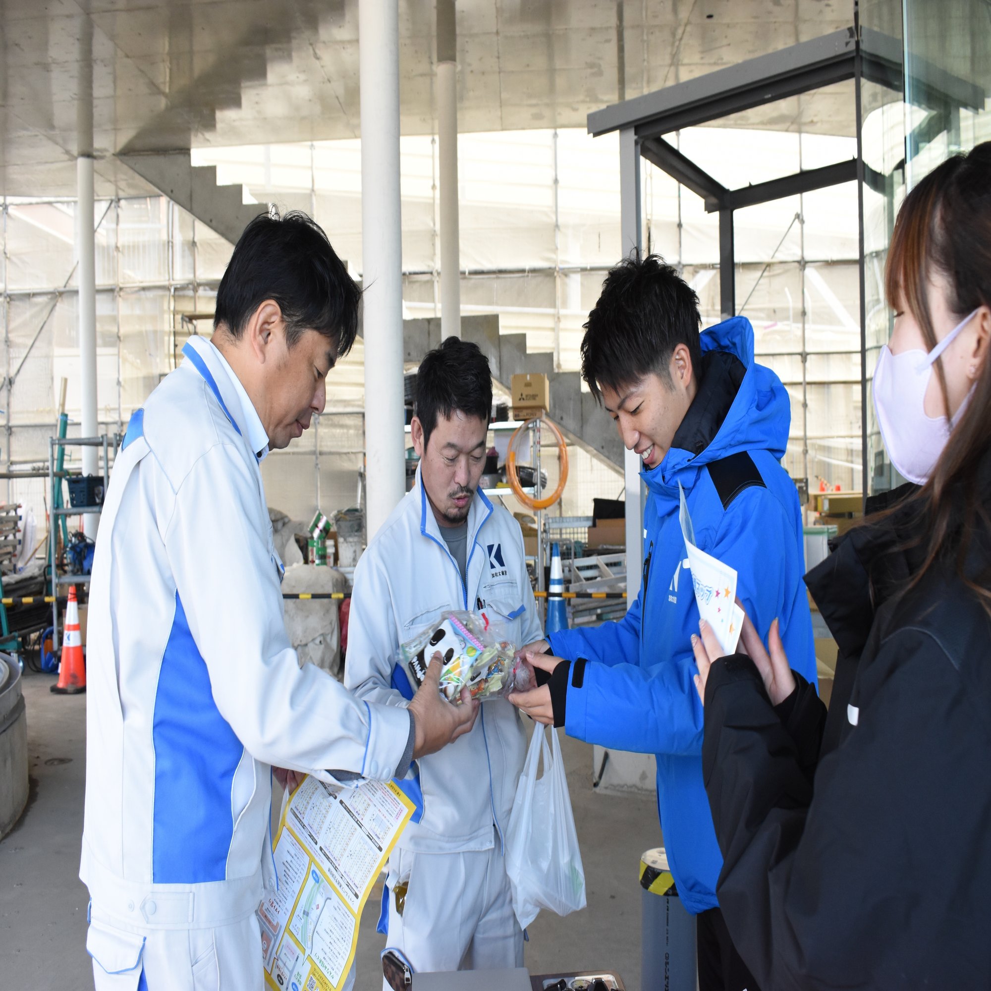 今回の新社屋は構造上、梁がなく、床・天井を打設してはじめて建物の最上部ができます。どのタイミングが上棟式…?というのが難しいところでしたが、屋上階の打設が完了し、工程的にも実施が可能となったこのタイミングを見計らい、上棟イベントを実施しました!