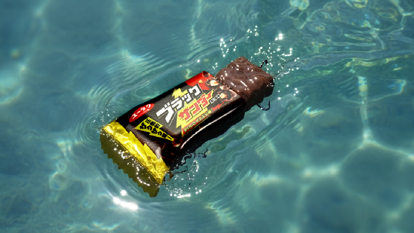 チョコバーのリアルさには強くこだわりました。本物のブラックサンダーを3次元スキャンしてデータ化し、実際の形状の凹凸や質感を忠実に再現しました。この工程によって、見た目だけでなく、手に取った時や水中でのシルエットも本物に近い、リアリティ溢れる仕上がりになりました。
