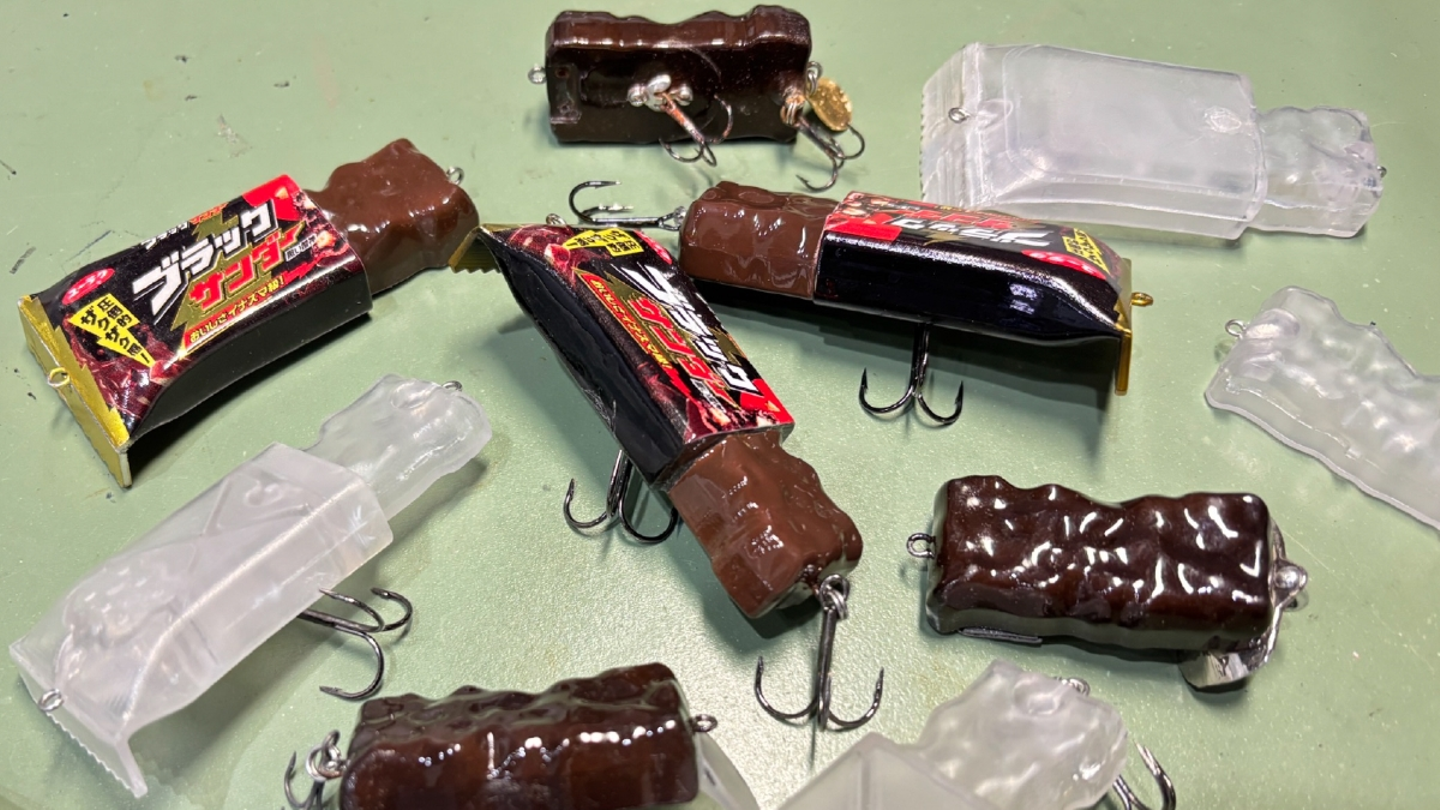 さらに、パッケージの質感とチョコの質感の差が大きく、ジョイント部分の隙間に不自然な段差や違和感が生まれやすかったのも難しいポイントでした。リアルさを追求すればするほど、ジョイント構造が浮いてしまう。これらを総合的に判断して、ブラックサンダーらしさとルアーとしての実用性が最も両立できる今の形状に至った、ということになります。