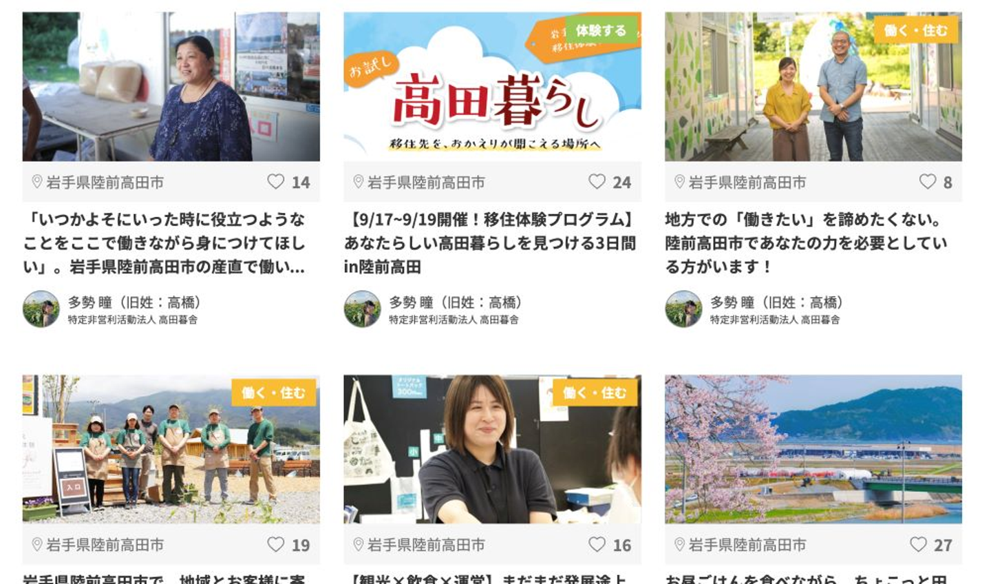 ▲岩手県陸前高田市のプロジェクト。人物写真を全面に出して地域住民にフォーカスした記事を載せたり、同じオンライン相談会でも切り口やターゲットを変えてみたりと、一般ユーザーと多面的につながれるように工夫されている