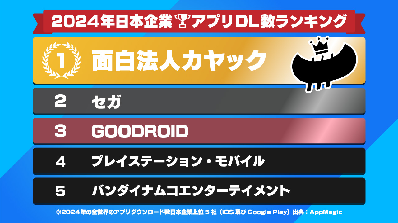 株式会社カヤック(本社:神奈川県鎌倉市、代表取締役 CEO:柳澤 ⼤輔、以下カヤック)は、米国のモバイルアプリデータプラットフォームを展開するAppMagicが集計した2024年の世界アプリダウンロード数(iOSおよびGoogle Play)において、日本企業として1位を獲得したことをお知らせいたします(※1)。これにより、カヤックは2021年より4年連続(※2)のアプリダウンロード数1位を獲得いたしました