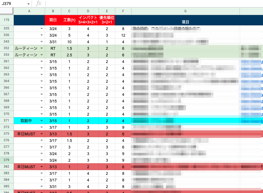 現在のタスクを書き出し、①見える化:期日・優先順位(≒緊急度)・インパクト(≒重要度)を数字で表す。②タスクの分類、方針決め:大タスク中タスクなどの粒度を揃える、やるやらないを決める、などを整理していきました。
