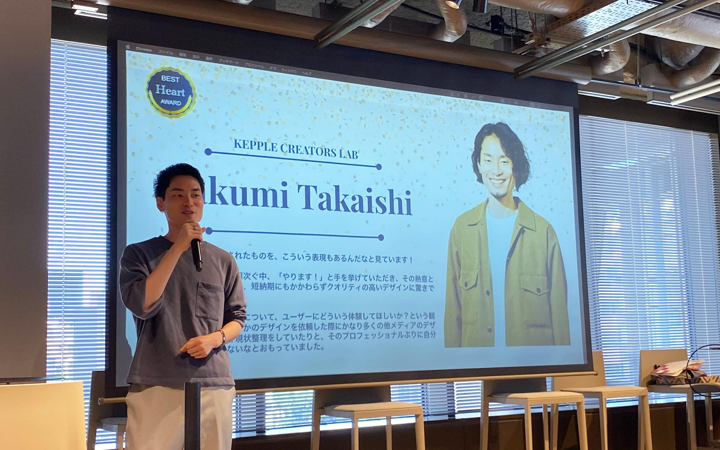 ▲「BEST Heart Award」に輝いたデザイナーの髙石さん。プロダクトのUI/UXデザインやケップル発行のアナリストレポートデザインなど、多方面で周りを鼓舞(Heart)する活躍でした!