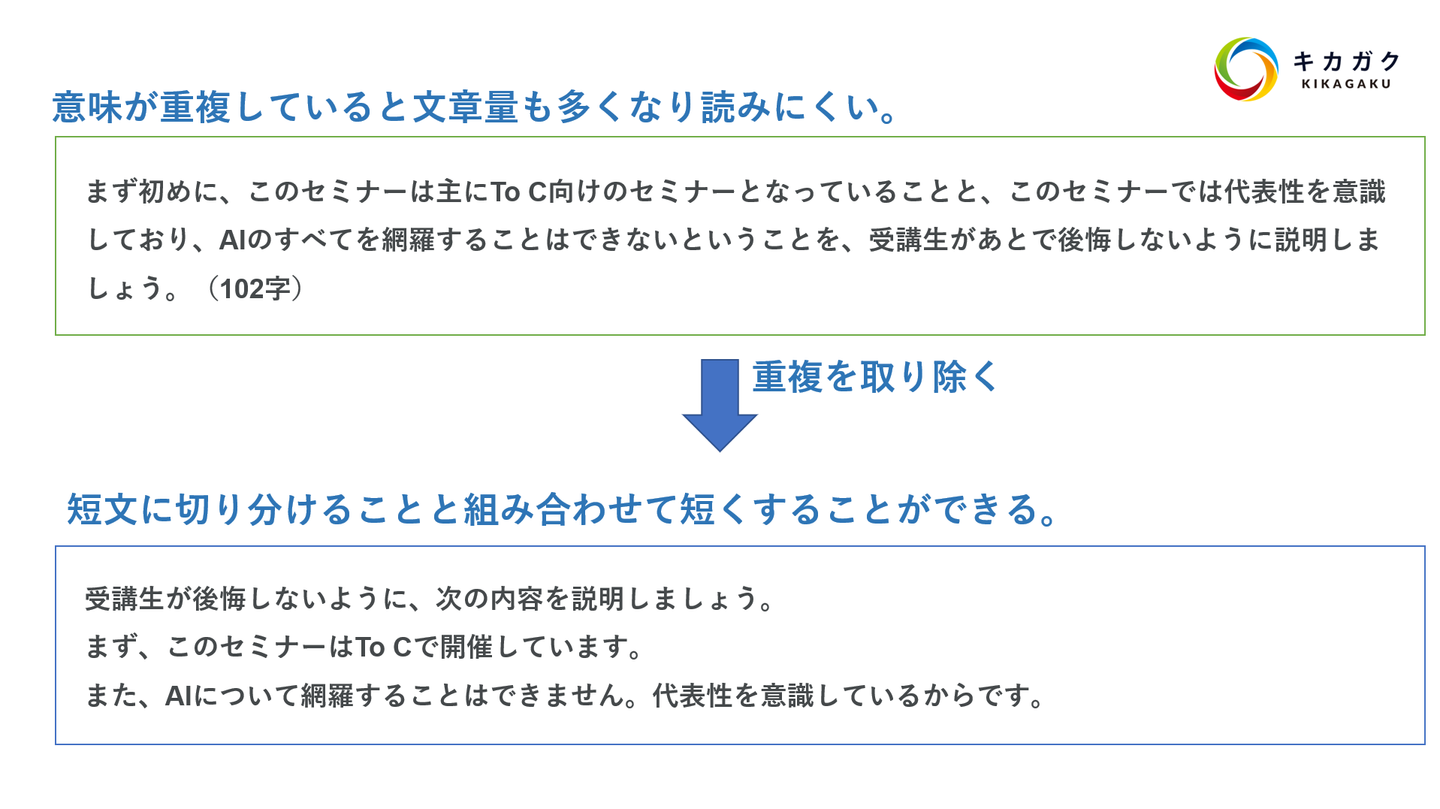 基本的には、一文の長さを調整する中で自然と削られていくものです。一文を適切な範囲に区切れば、意味の重複や、係り受けの迷子もなくなっていきます。