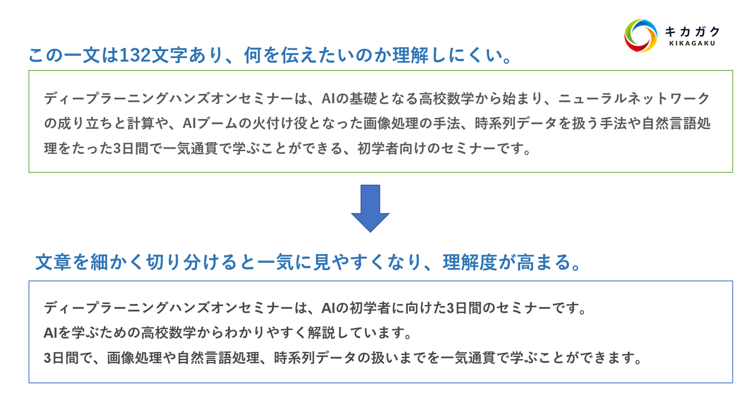 長文の特徴として、意味の重複がある。また、係り受けがわからない修飾語があることが挙げられます。