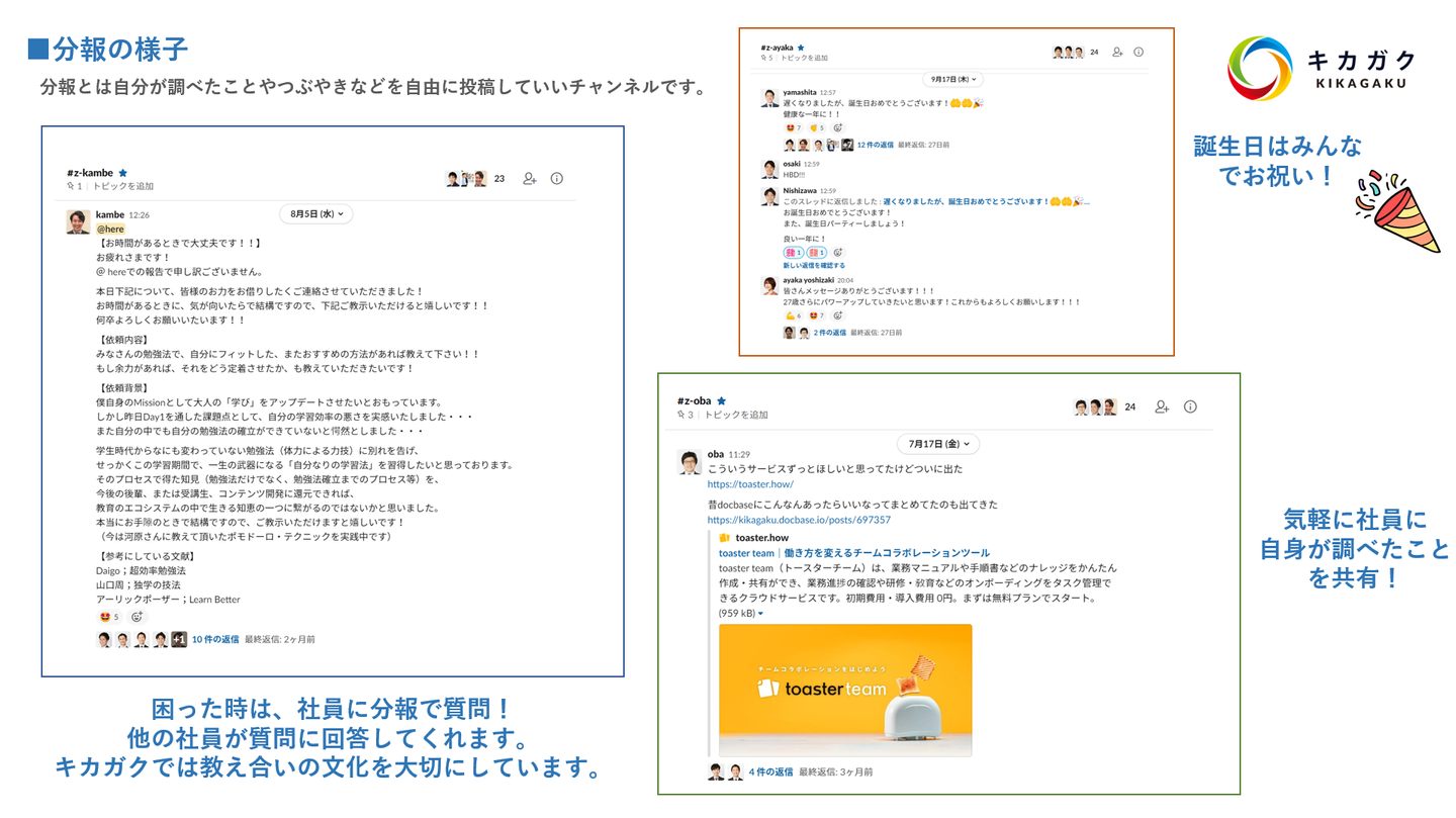 分報があることで、社員が日々どんなことを学んでいるのか発信することで、他の社員の方がこんなことを学んでいるのかと知ることができるかつ、足りなかった知識を補うきっかけになります。