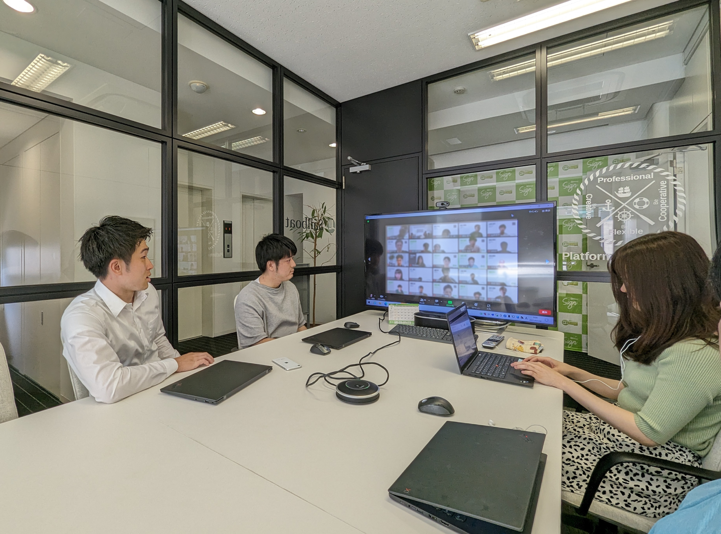 東京オフィス出社組・広島オフィス出社組・全国各地のリモートメンバーがオンラインでコミュニケーションを取っています。