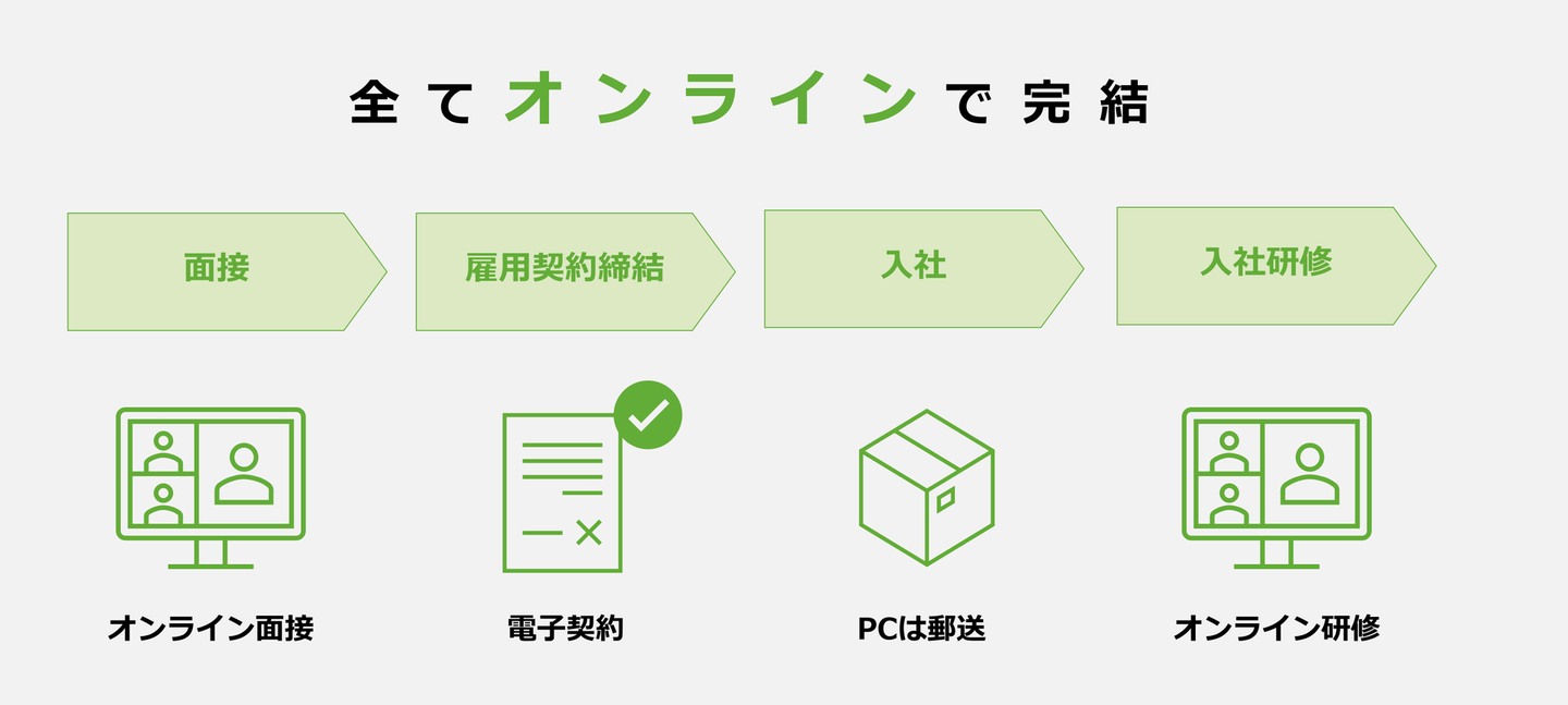 面接は全てオンライン、雇用契約書なども電子契約で行い、業務で使うパソコンは郵送で送っていただきました。地方在住の社員でフルリモート勤務の人は、必ずしも入社日などに出社する必要がないので、お子さんがいらっしゃる方&引っ越しを伴う場合は保育園の慣らし保育などもある中での入社となるため、とてもありがたいなと思いました😊
