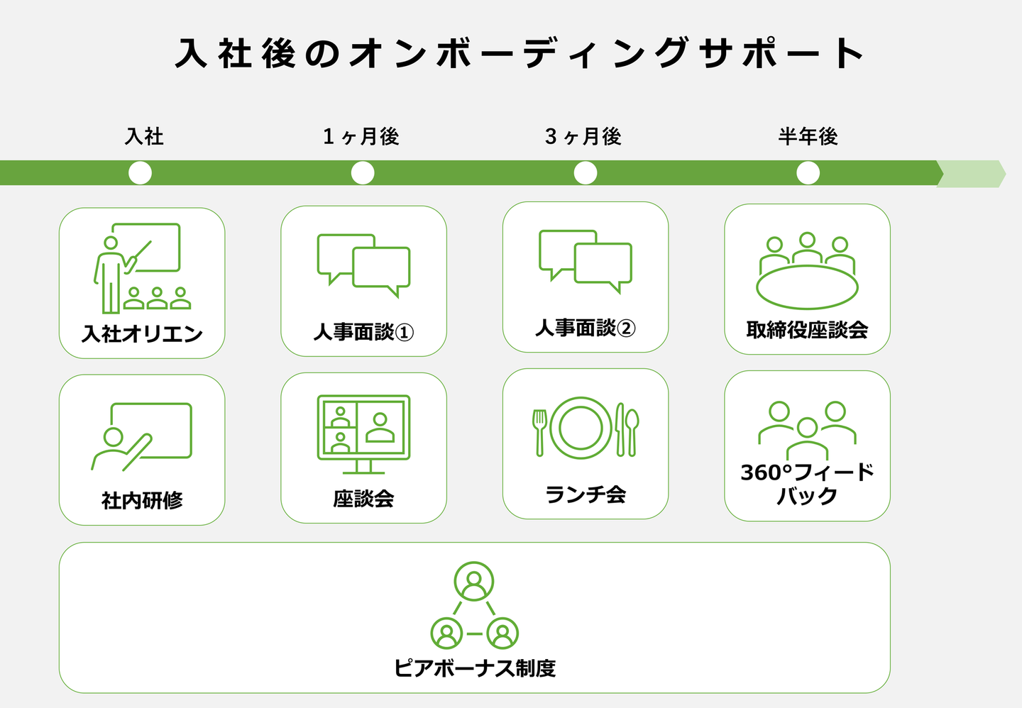 面接や入社前後でコミュニケーションを取っていた人事と、1ヶ月後・3ヶ月後のタイミングで定期面談がありました。入社時に伝えられていた各自のミッションについてズレがないか、チームでのコミュニケーションがうまくいっているか等をヒアリングしてくれました。また、同月入社の5名+取締役3名で入社6ヶ月後に行われた『オンボーディング座談会』では、以下について話し合いました。