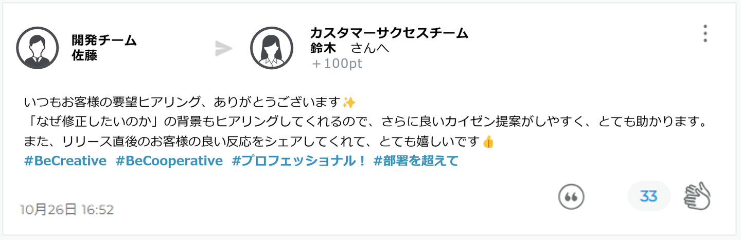 感謝ポイントを送り合えるピアボーナス制度のUniposは、セイルボートではかなり前から導入しているそうで、毎日のように部署を超えたポイントの送り合いがされているのを入社後見ることができました。「社員同士がどうコミュニケーション取っているのか、どういう行動が社内で称賛されるのか、どういう行動がVALUEに基づく行動なのか」を投稿から見ることができました。文化の醸成にはとても良いツールだと思います。
