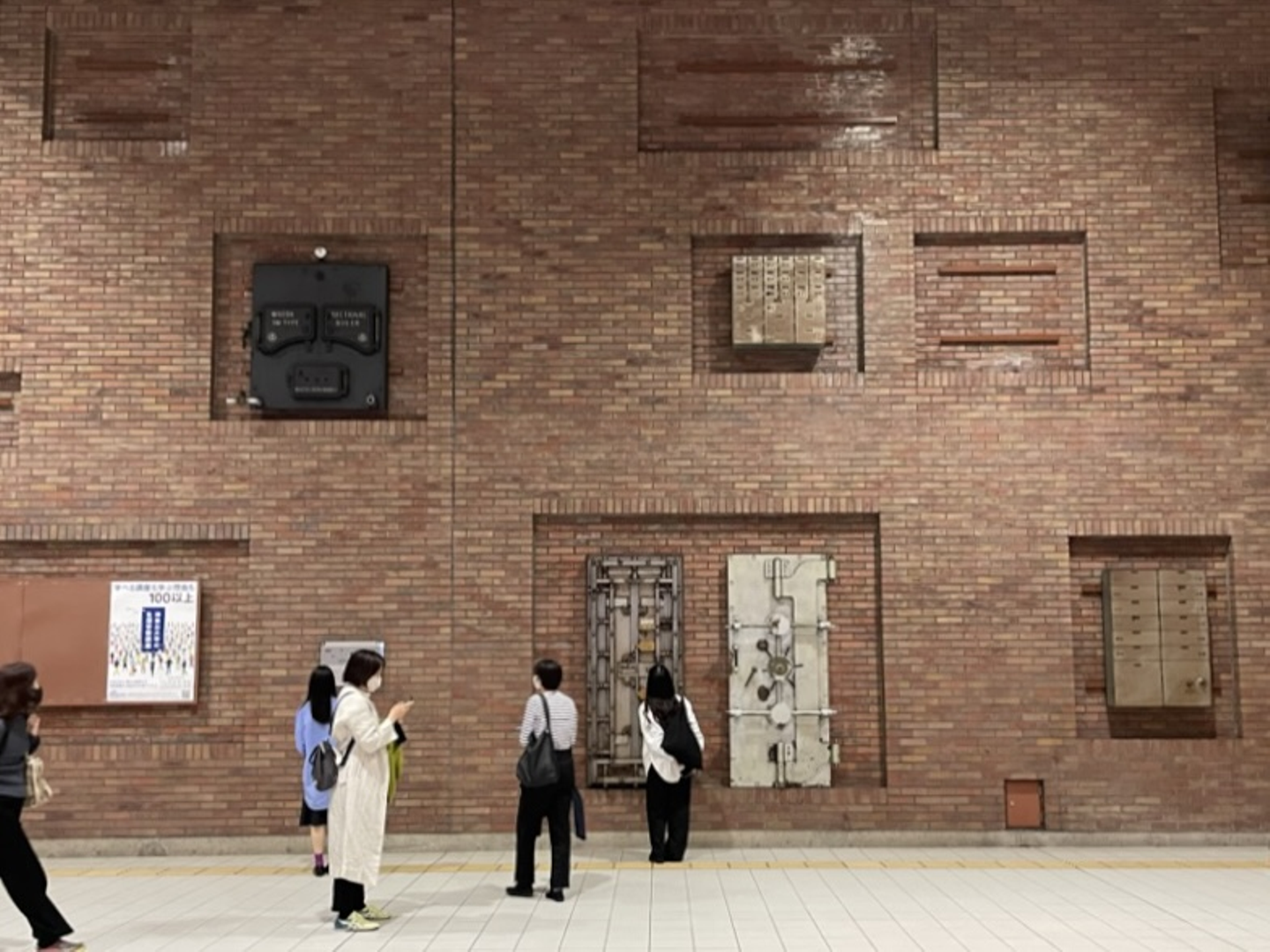 また、改札を出て、レンガ壁面に取り付けられているのが、この土地にかつて建っていた横浜銀行旧本店から譲り受けたという金庫扉。この土地の遺産が、現代生活の一部として欠かせない駅に溶け込んでいる、非常に魅力的な空間だと思いました。
