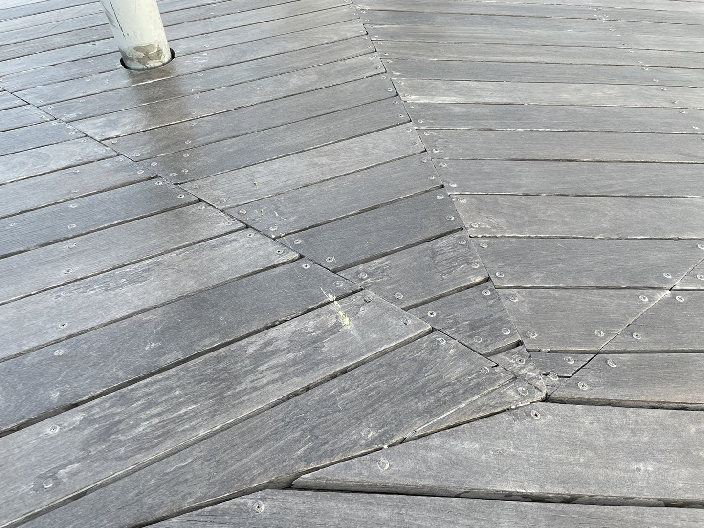 足元を目を凝らして見てみると、デッキ材はその形にフィットするよう、綿密な寸法で切断されていました。