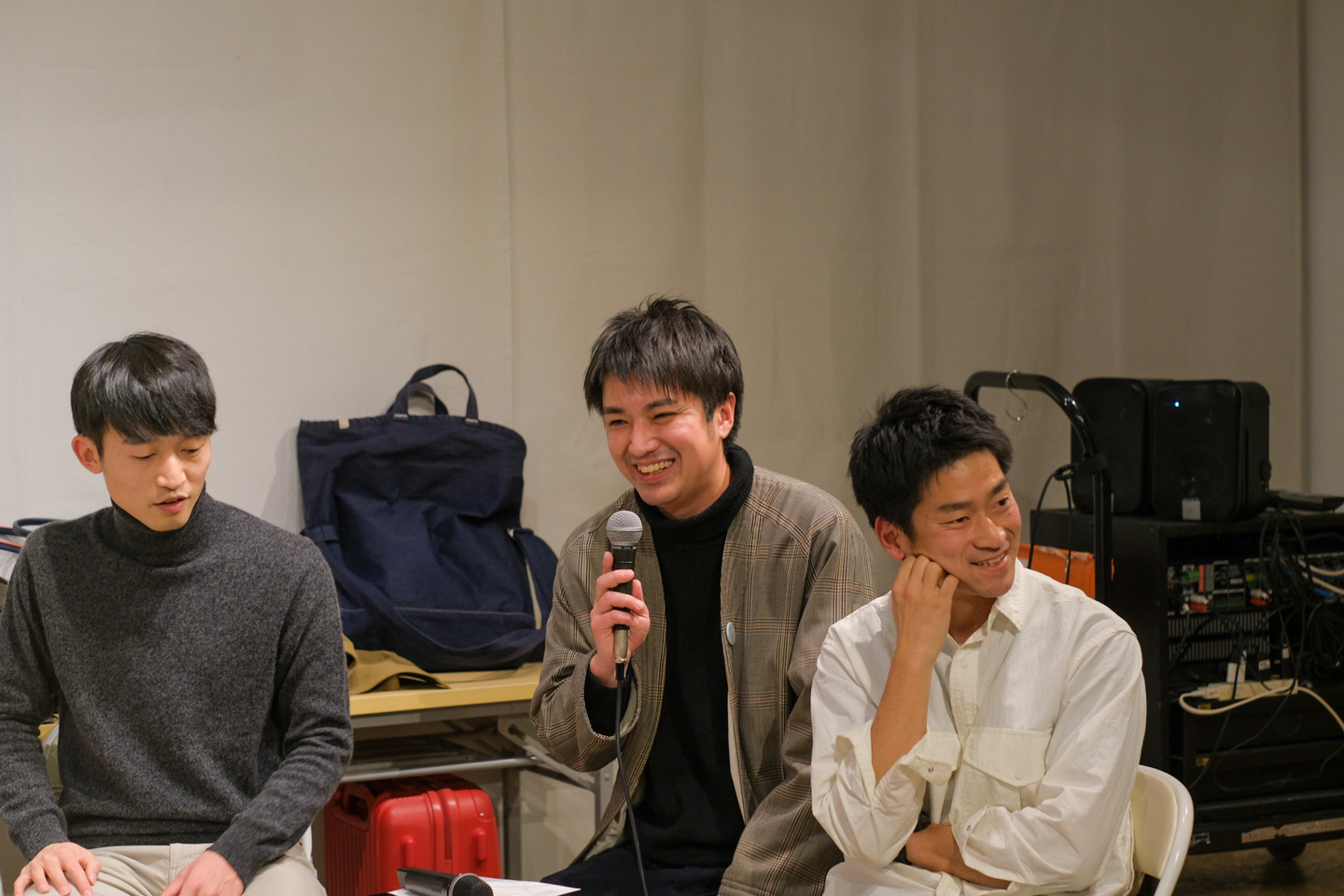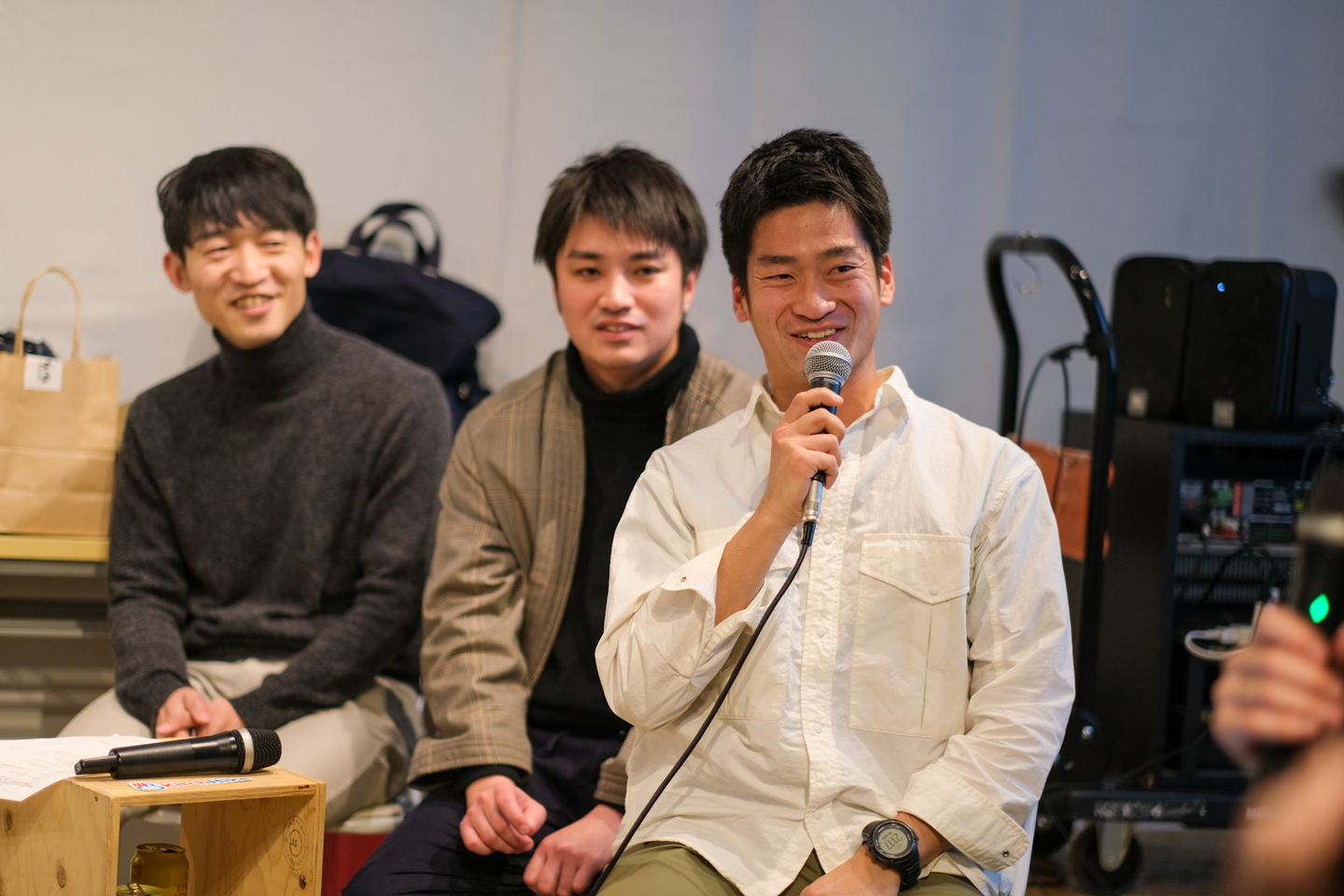 「学び仲間」としてセッションを行ったのは、ホールアース自然学校スタッフ・富士山麓ジビエ所員の壽榮松(すえまつ) 孝介さん(写真右)と、「稲とアガベプロジェクト」代表・どぶろく醸造所 木花之醸造所 醸造長の岡住 修兵さん(写真中央)。