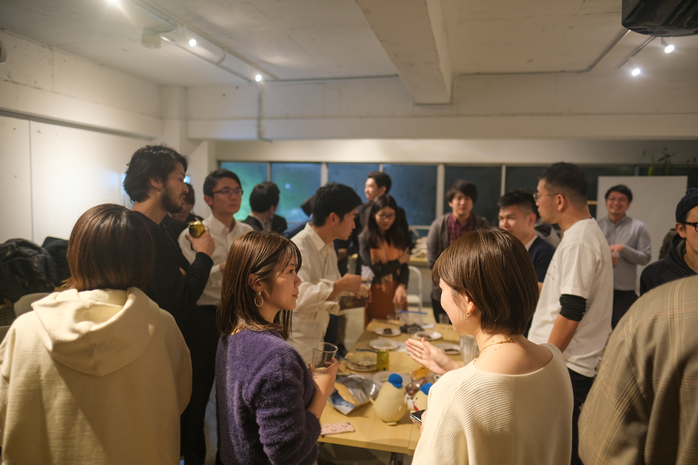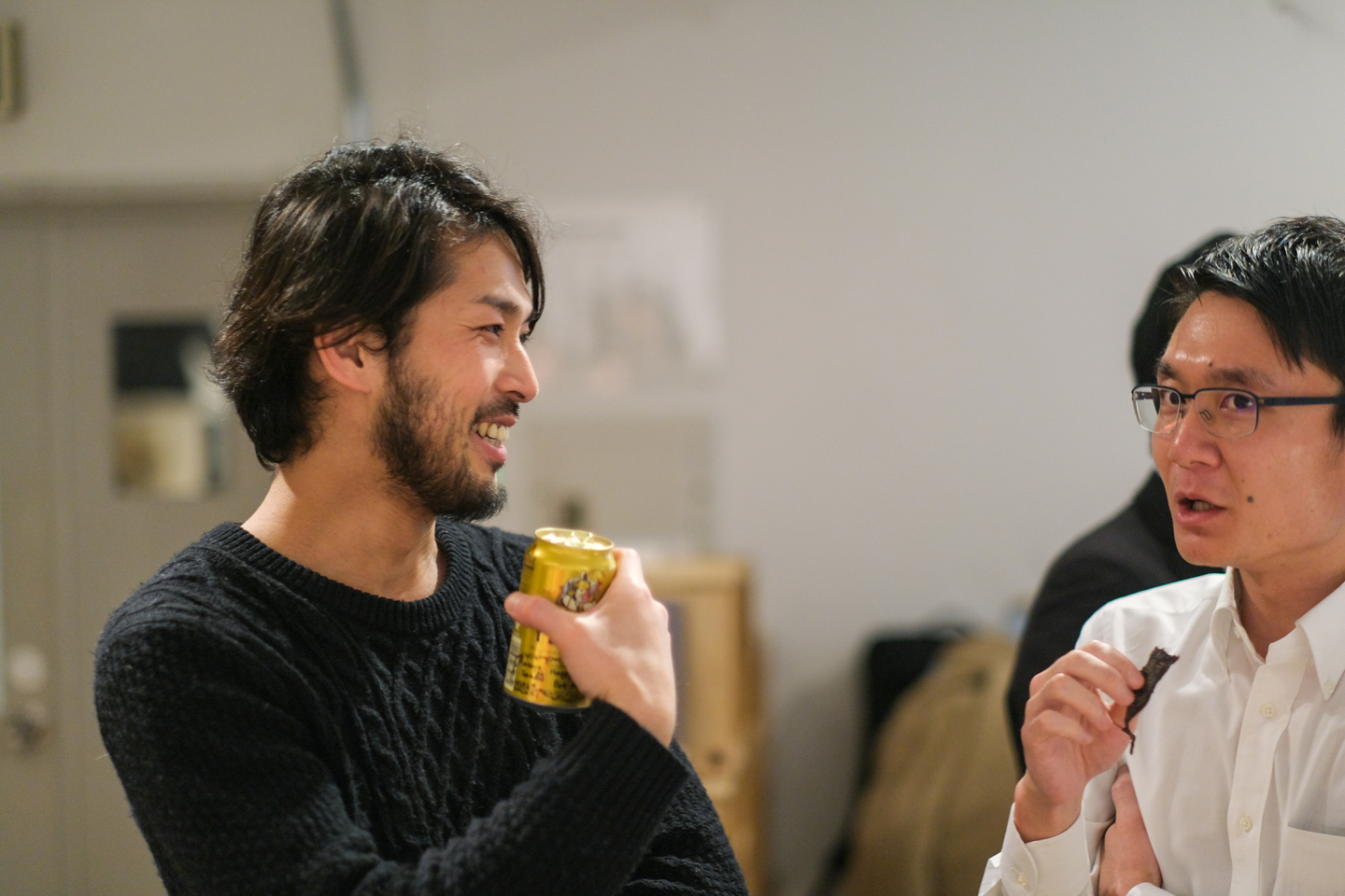 イベントの最後には懇親会が行われました。この日会場に集まったのは、30人以上のお客さんたち。日本酒や焼酎・ビールを片手に、壽榮松さんが獲った鹿肉や岡住さんが持ってきてくださった秋田の名産品などをつまみ、それぞれが話に花を咲かせていました。