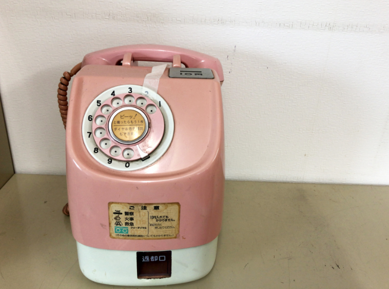 ダイヤル式のピンク色公衆電話。時代を感じます。