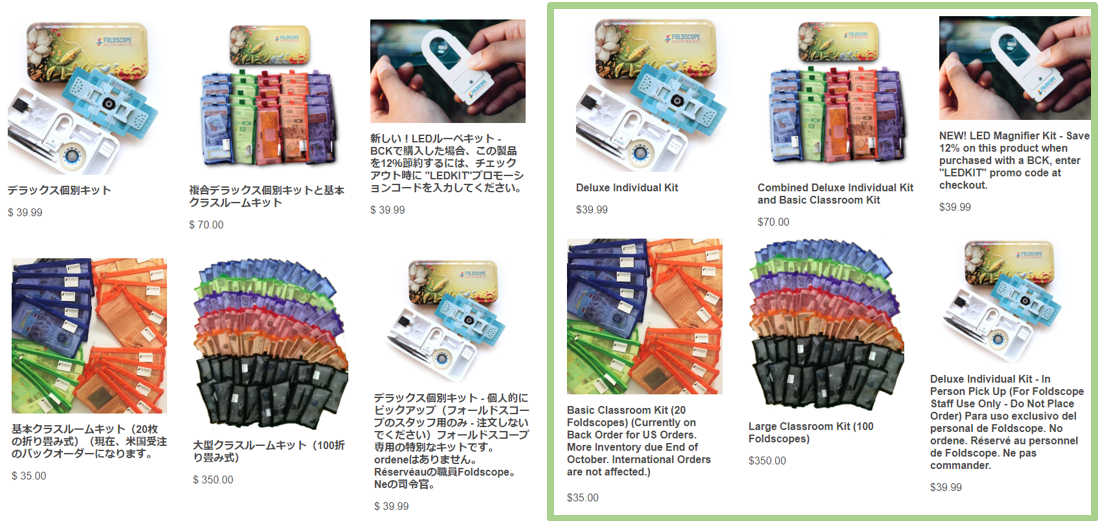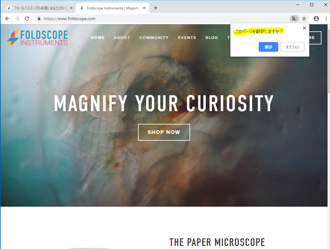 たまに誤訳もあるので油断はできません。※Shop Foldscope Kitsがチョコレートキットに訳されてます。