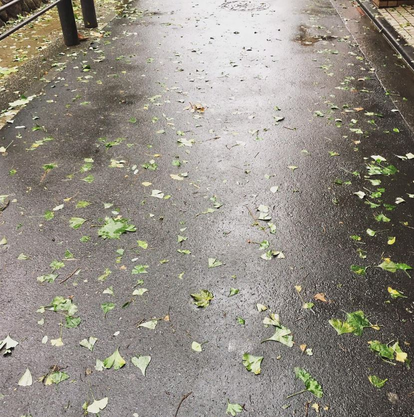 風でとばされた葉っぱが雨に濡れて水分を含み色んなところにくっついていました。