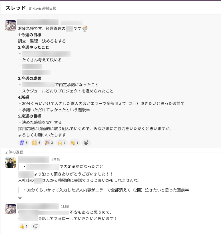 開発、ビジネス問わず全メンバーが週報を出しており、自身の所属チーム以外でもコメントをつけたり、質問をしたりしています。特に、COOの君島やCTOの古濱は積極的にコメントしているので、そういった、垣根を超えた声かけは役割問わず活発に行われています。