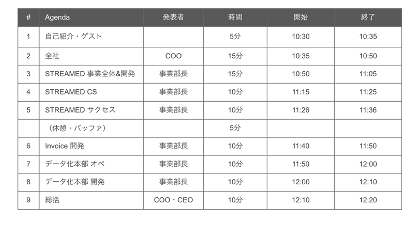 オールハンズの流れはこのようになっています。月単位の場合は1時間程度、今回のように期を振り返る場合ですと、最大2時間くらい休憩を挟みながら進行していきます。