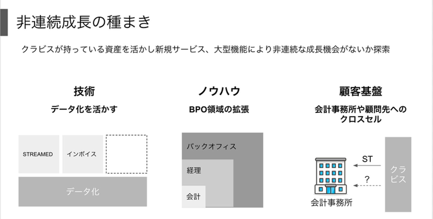 クラビスのプロダクトであるSTREAMEDやマネーフォワード クラウドインボイスはAIとオペレーターによりアナログデータをデジタルデータに変換するデータ化技術をコアとしています。この技術はクラビスの資産であり、大きな強みです。自社の技術的な強みを礎として、別のサービスを生み出していくことが1つ目の手段です。
