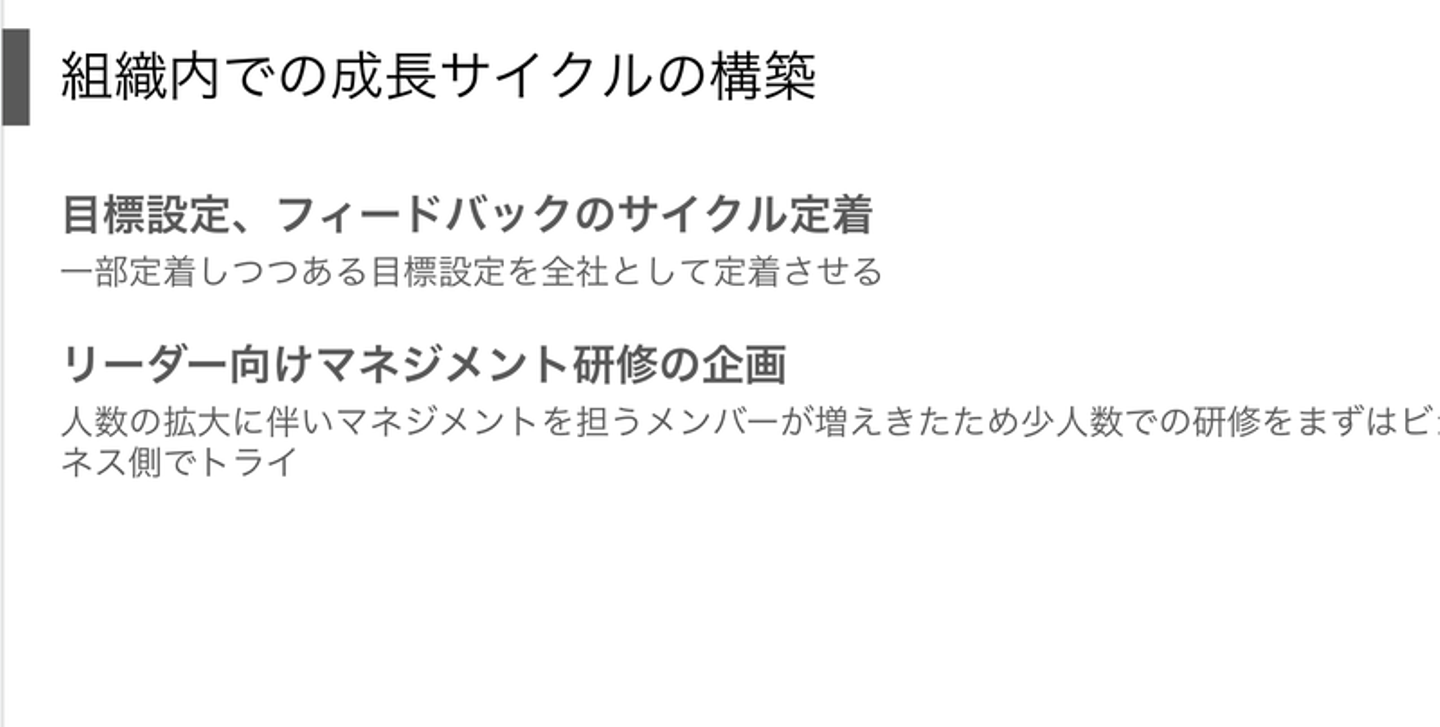 まず、目標設定〜フィードバックのサイクルですが、現状でも行ってはいるものの業務の目線を上げるために定期的に振り返りをするまでにはいたっておりません。半期ごとの評価のタイミングではじめて振り返りとフィードバックをするサイクルでは、当然ながら軌道修正が遅いということになります。そのため、これらのサイクルの頻度を縮め定着させることをまずは実施していきます。
