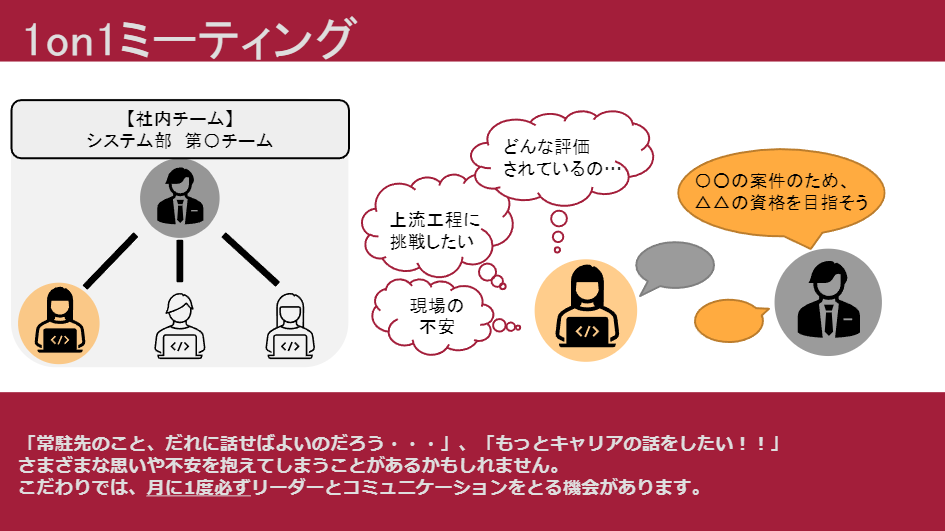 こだわりでは、月に1度、チームリーダーとの1on1ミーティングを実施しています。