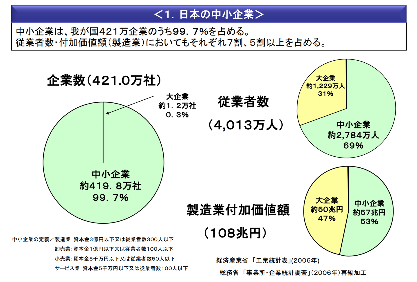 こちらは経済産業省が発表している『最近の中小企業の景況について』という資料のデータですが、日本には421.0万社もの企業があり、その内99.7%が中小企業です。