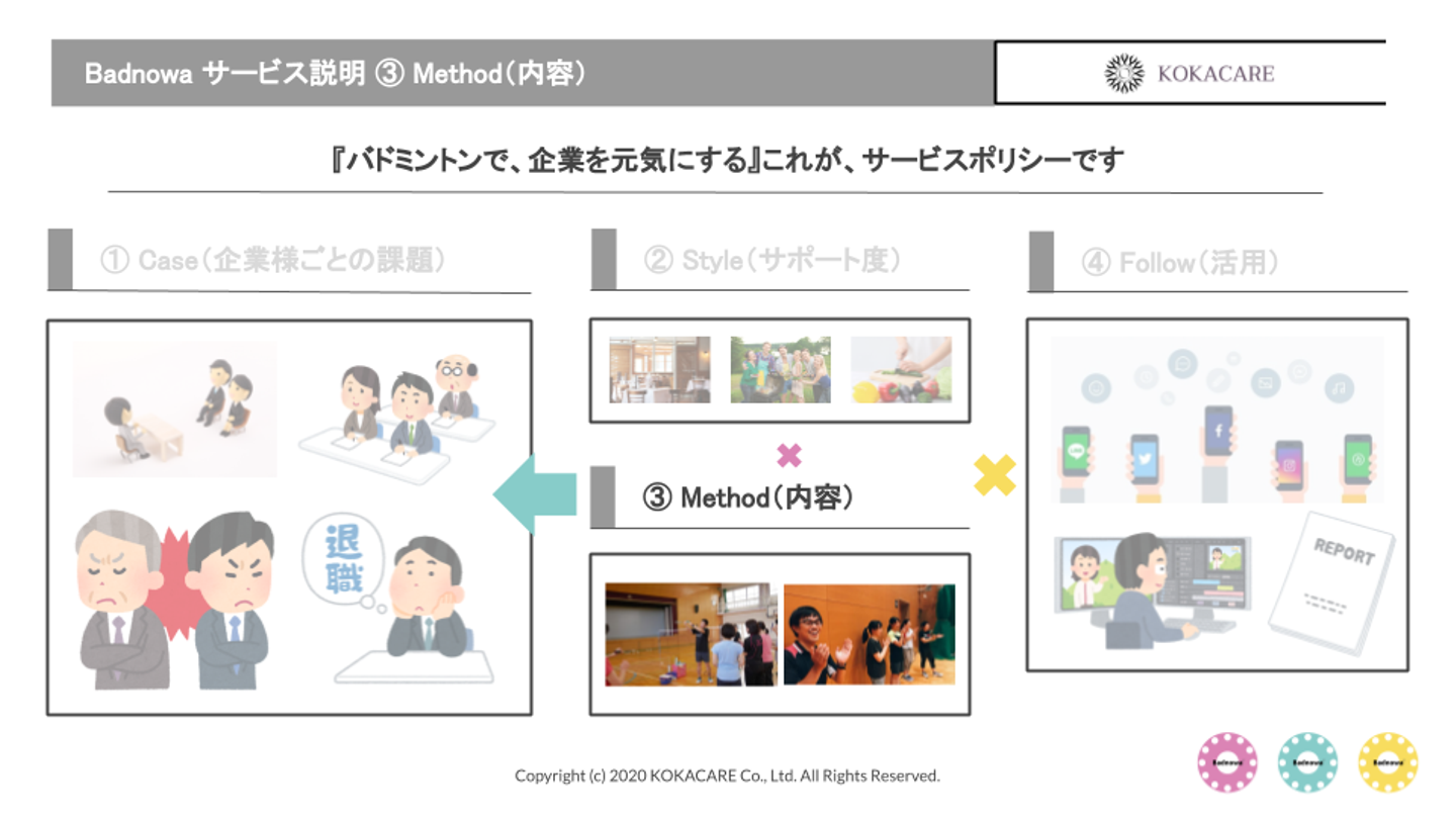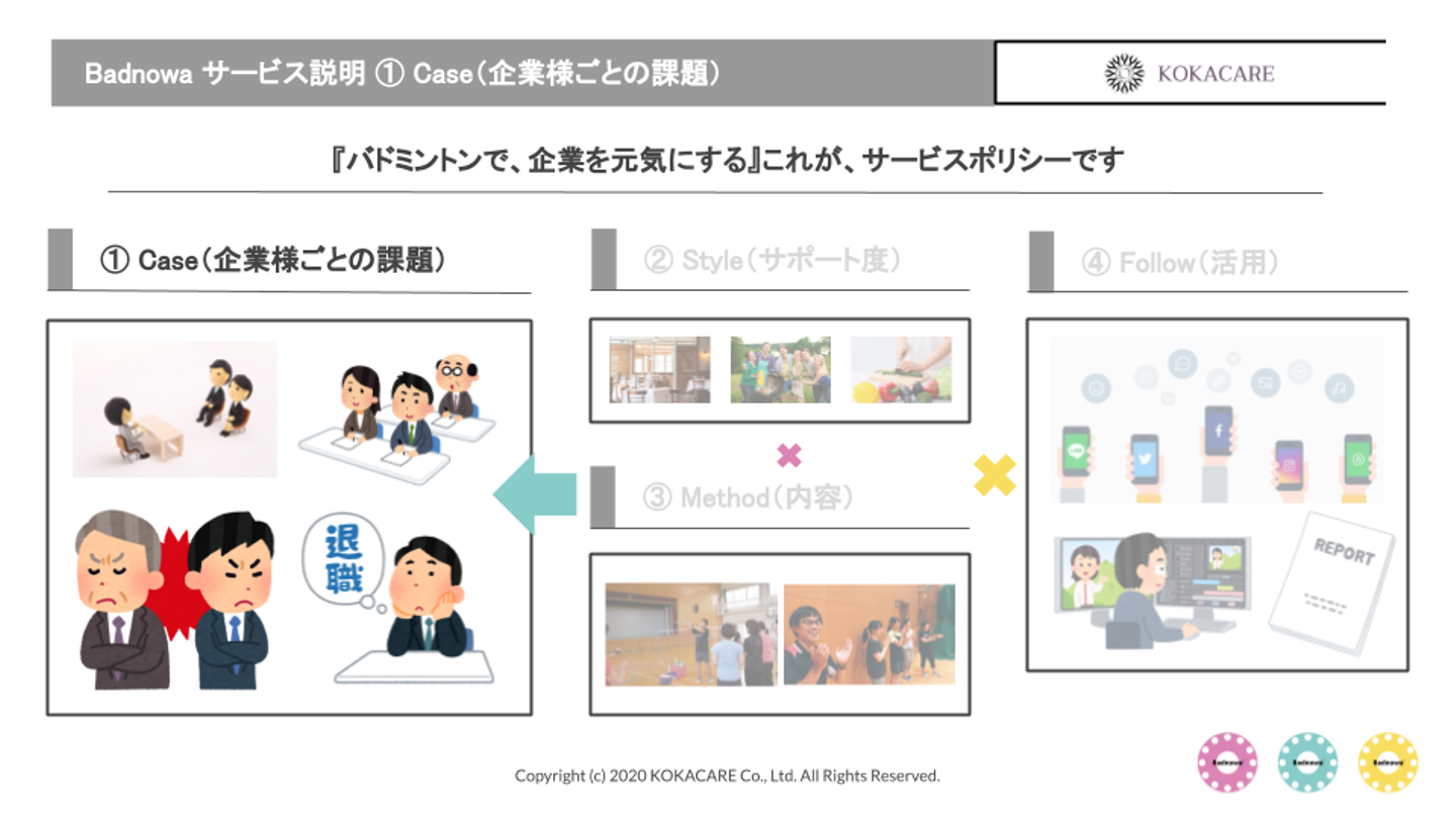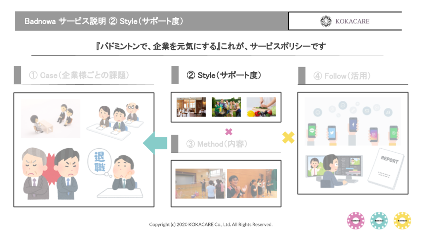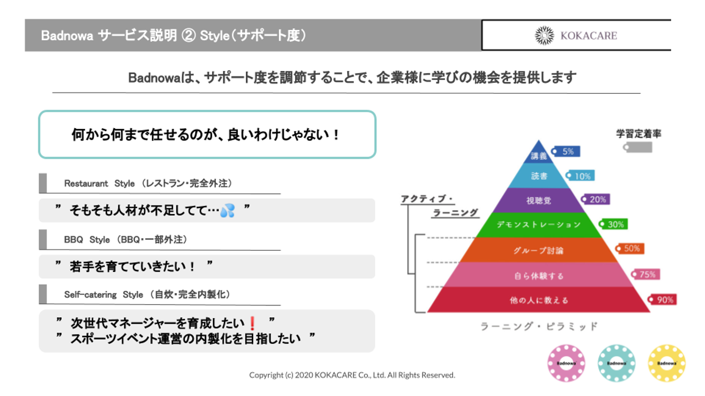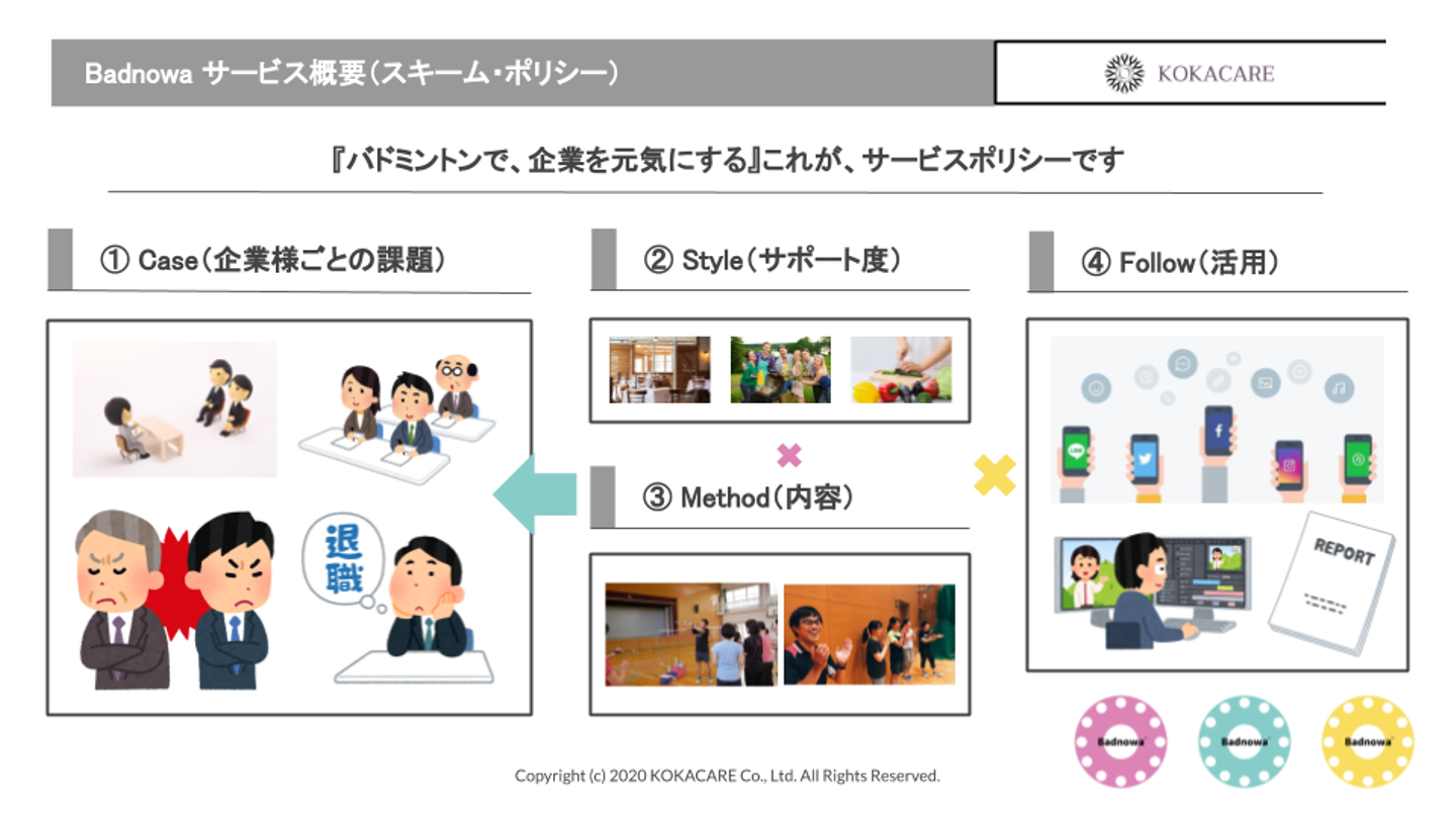 どう言うことかよく分かりませんね…。簡単にまとめるとKOKACAREがどれくらい自分たちでバドミントンイベントを運営するかということです。というか企業さまの課題によっては、何から何までおまかせするのが、必ずしも良いわけではありません。