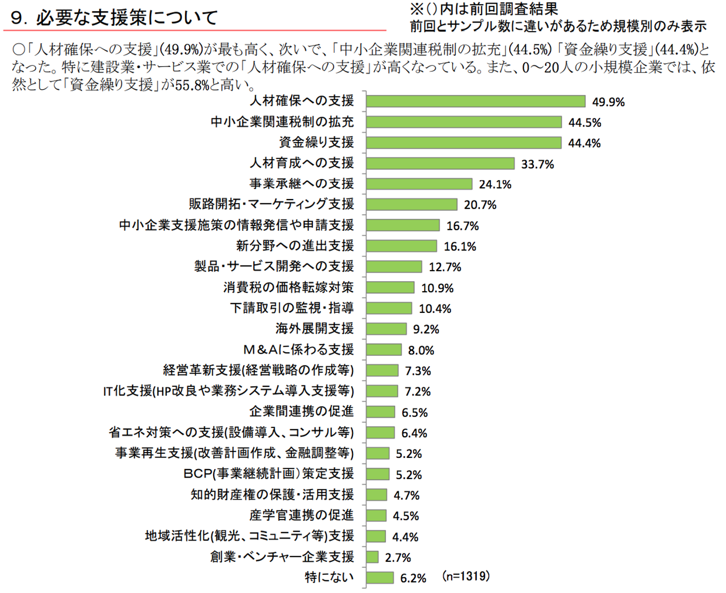 これらは悩みの一部分を切り出したものですが、商工会議所が発表している『中小企業の経営課題に関するアンケート結果概要』では、商工会議所に求める必要な支援策として、こんなデータが出ています。
