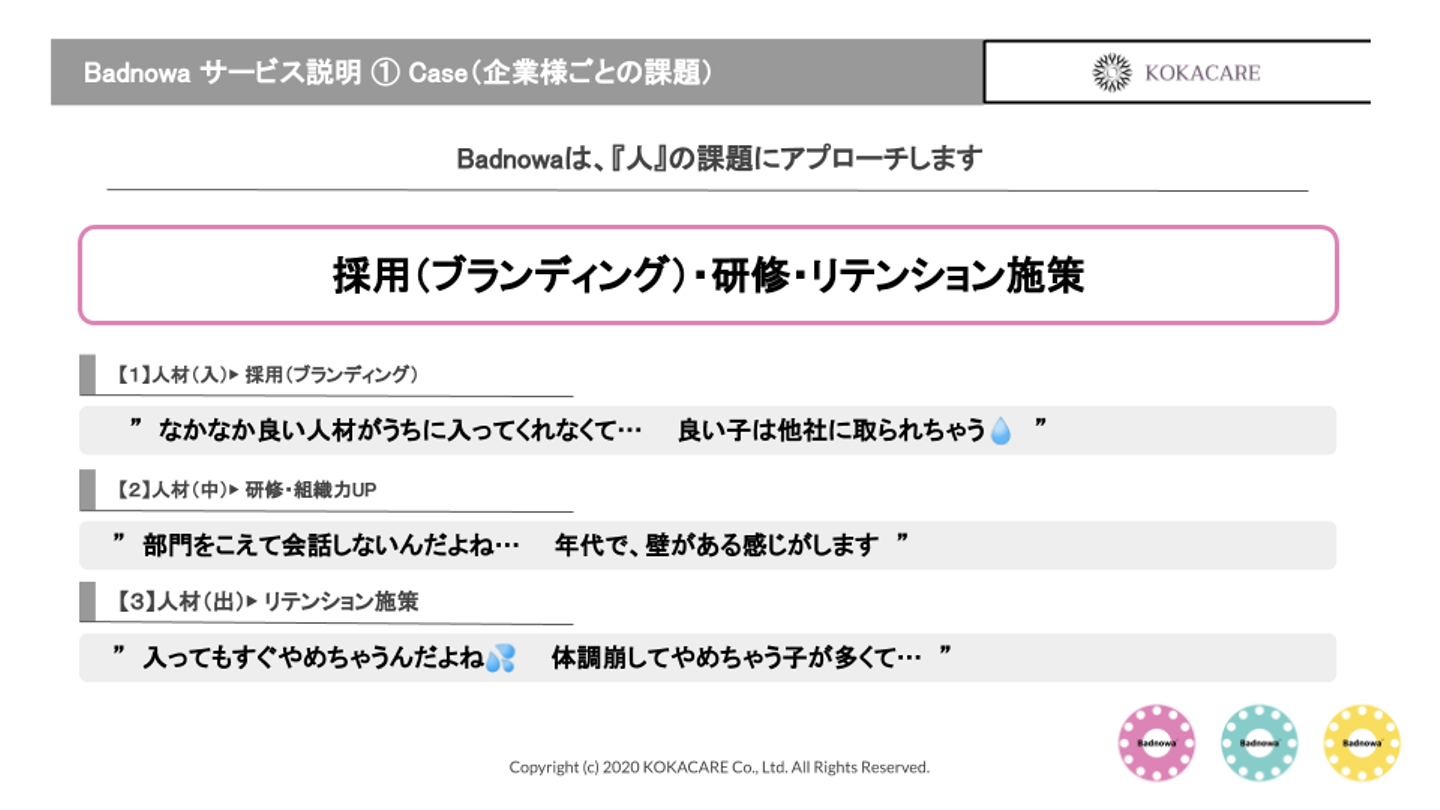 このサービススキームを見て分かる通り、一番最初の企業の課題(①Case)をしっかり把握することはとても大切です。企業の課題は、大きく二つに分かれていて、だいたい『人』と『お金』です。その中でも、Badnowaは『人』の悩みに寄り添うサービスです。『人』の悩みにはこんなものがあります。