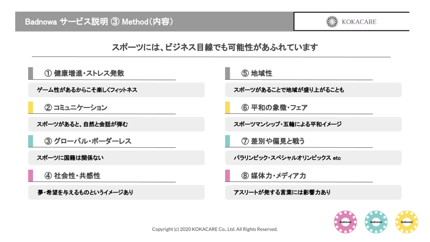 『Badnowa』は、”ばどのわ”と読みまして、バドミントンを通して元気にする企業を増やしていくことで、バドミントンの輪が広がっていく。この影響の輪をさらに編集して、Badnowaに関わってくださった企業様のさらなる発展に寄与する。