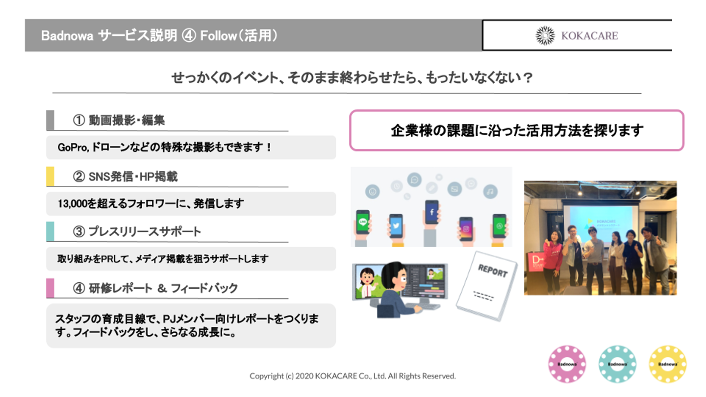 どう活用させるかは、企業の課題次第ですが、SNS発信やKOKACAREのHP掲載、プレスリリースサポートをしてメディア掲載を狙ったり。イベント中に特殊な撮影をして、発信の魅力をあげたり⭐️