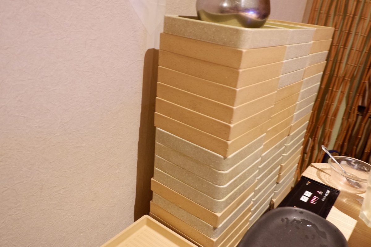 皿の山を背に小休止、この時点ではまだ余裕の笑顔。