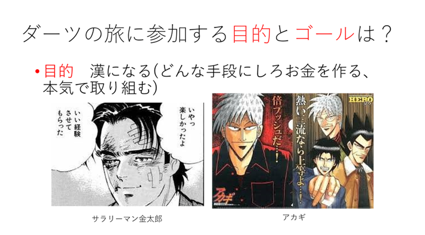 朝礼で社長から「谷口くんはダーツの旅に行きたいのかね?」と問われ、行きたいとの意思表示があったため、翌日の朝礼で全社員に向けてプレゼンを行うことが決まりました。