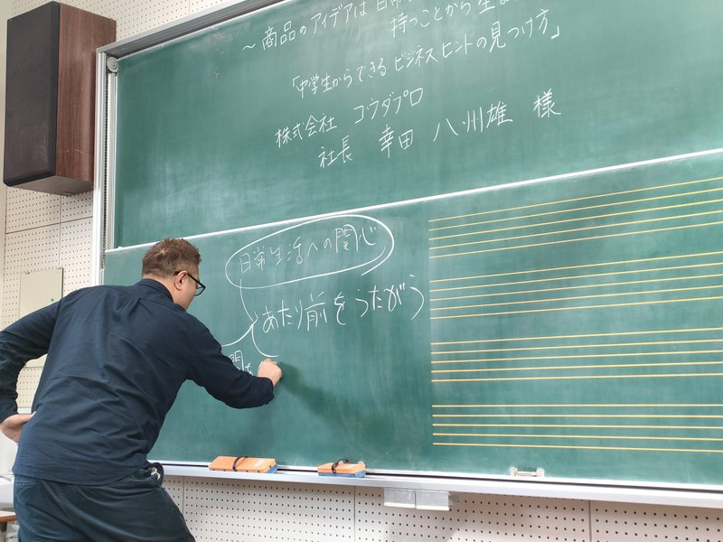黒板に『商品のアイデアは日常に関心を持つことから生まれます。』と書いてありますが、どうして日常生活に関心を持つとビジネスや商品のアイデアが見つかると思いますか?」